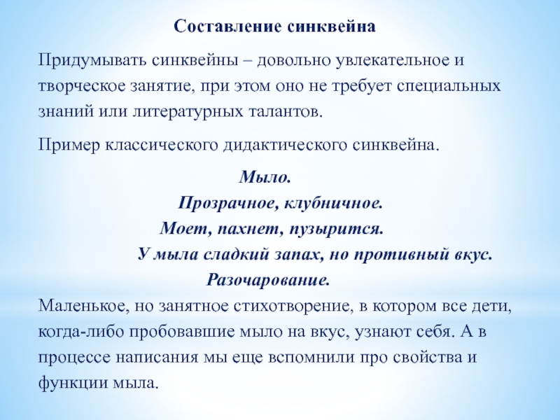 Придумывать синквейны – довольно увлекательное и творческое занятие, при этом оно не требует специальных знаний или литературных талантов.