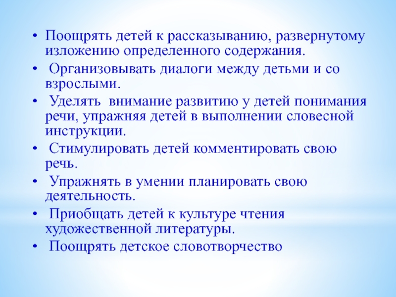 Слайд 7Поощрять детей к рассказыванию, развернутому изложению определенного содержания.