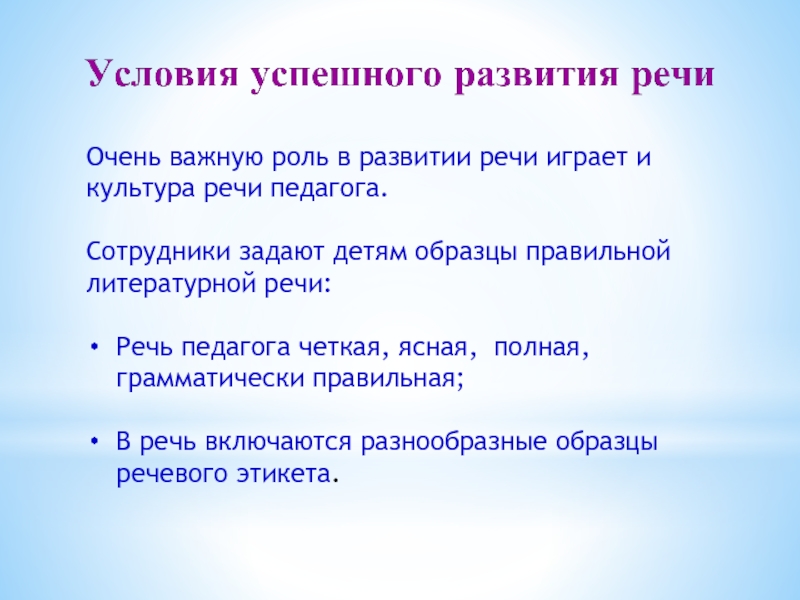 Слайд 4Очень важную роль в развитии речи играет и культура речи педагога.