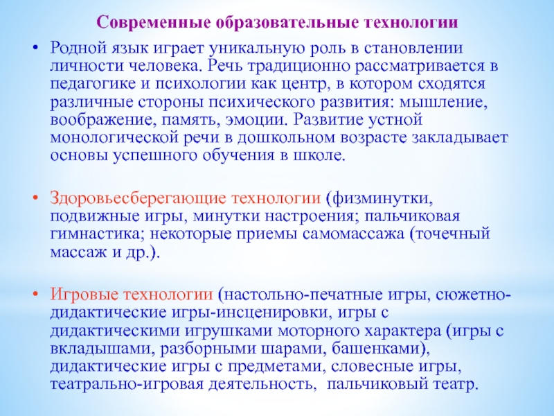 Игровые технологии (настольно-печатные игры, сюжетно-дидактические игры-инсценировки, игры с дидактическими игрушками моторного характера (игры с вкладышами, разборными шарами, башенками), дидактические игры с предметами, словесные игры, театрально-игровая деятельность, пальчиковый театр.
