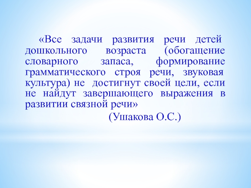 формирование грамматического строя речи, звуковая культура) не достигнут своей цели, если не найдут завершающего выражения в развитии связной речи»