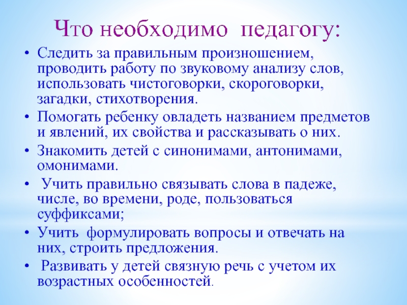 Слайд 6Следить за правильным произношением, проводить работу по звуковому анализу слов, использовать