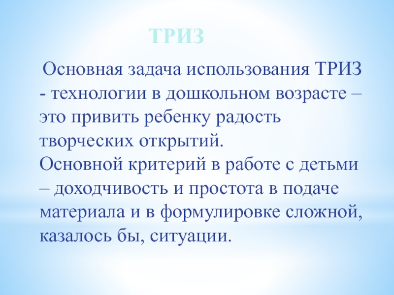 Основная задача использования ТРИЗ - технологии в дошкольном возрасте – это