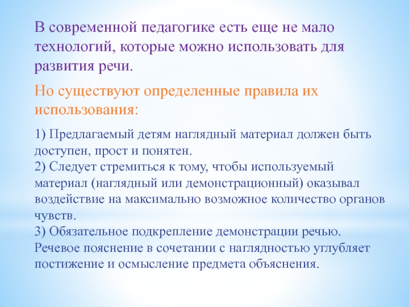 3) Обязательное подкрепление демонстрации речью. Речевое пояснение в сочетании с наглядностью углубляет постижение и осмысление предмета объяснения.