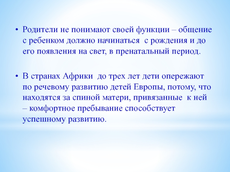 Слайд 5Родители не понимают своей функции – общение с ребенком должно начинаться