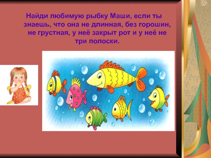 Найди любимую рыбку Маши, если ты знаешь, что она не длинная, без горошин, не грустная, у неё закрыт рот и у неё не три полоски.