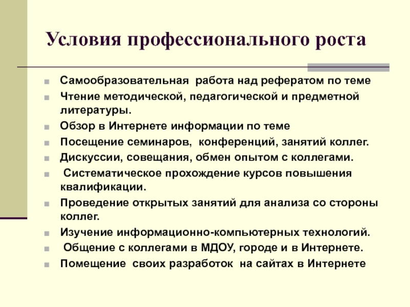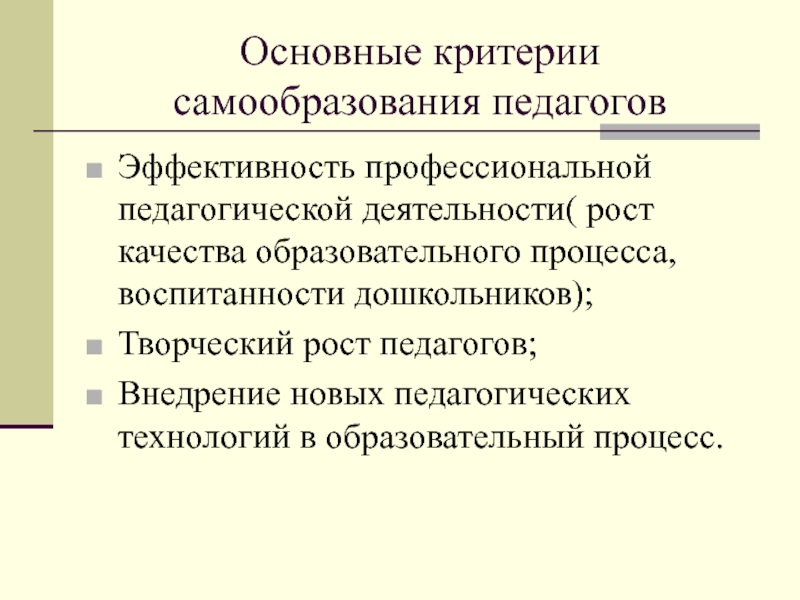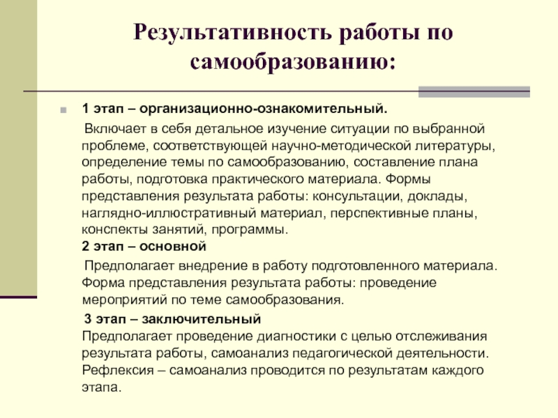 себя детальное изучение ситуации по выбранной проблеме, соответствующей научно-методической литературы, определение темы по самообразованию, составление плана работы, подготовка практического материала. Формы представления результата работы: консультации, доклады, наглядно-иллюстративный материал, перспективные планы, конспекты занятий, программы.