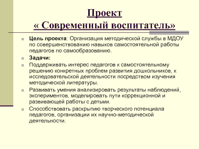 Поддерживать интерес педагогов к самостоятельному решению конкретных проблем развития дошкольников, к исследовательской деятельности посредством изучения методической литературы.