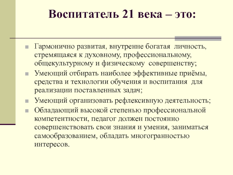 Обладающий высокой степенью профессиональной компетентности, педагог должен постоянно совершенствовать свои знания и умения, заниматься самообразованием, обладать многогранностью интересов.