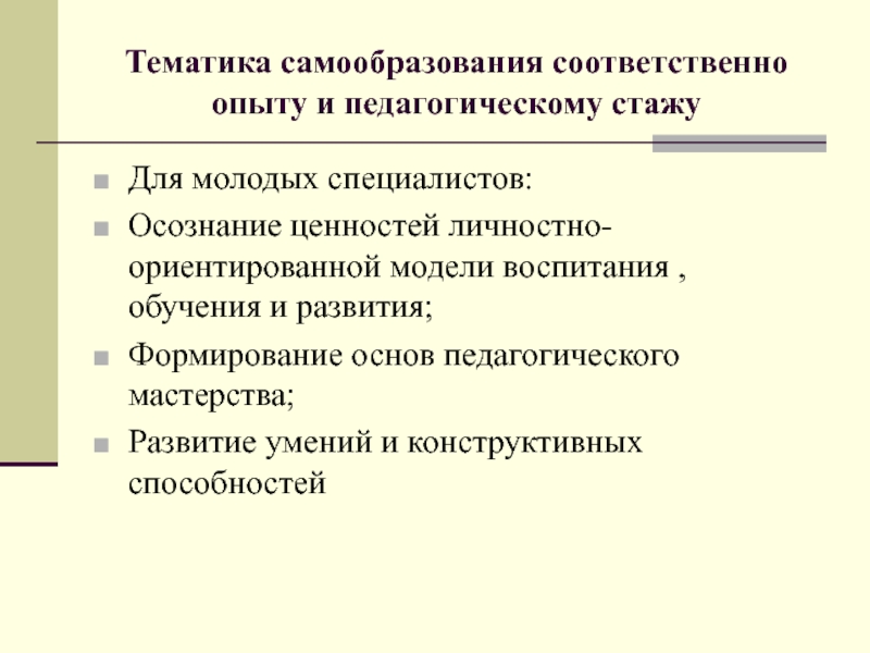 Слайд 8Тематика самообразования соответственно опыту и педагогическому стажу