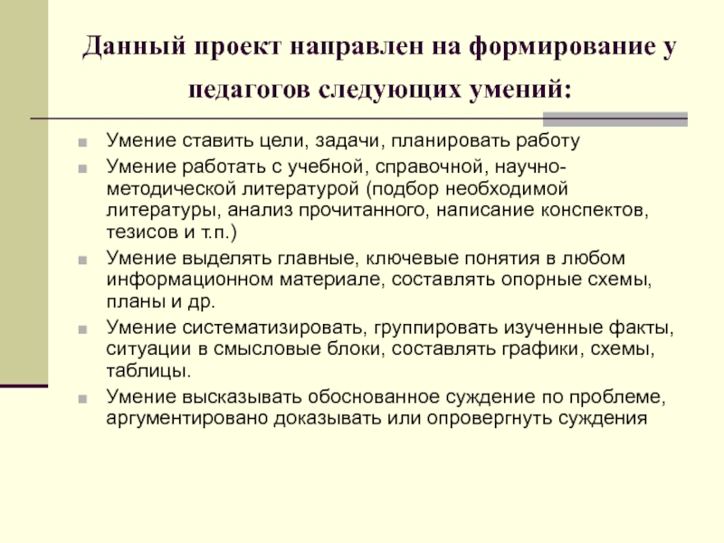 Слайд 13Данный проект направлен на формирование у педагогов следующих умений: