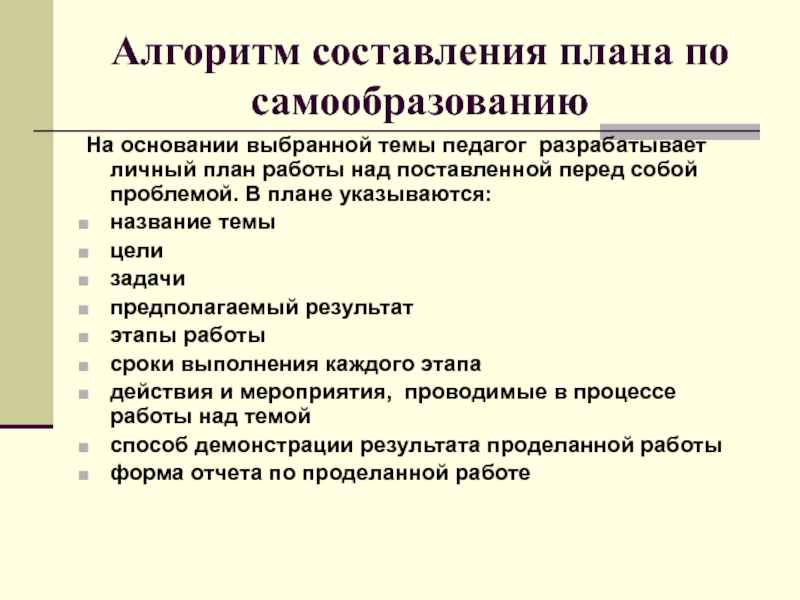 личный план работы над поставленной перед собой проблемой. В плане указываются: