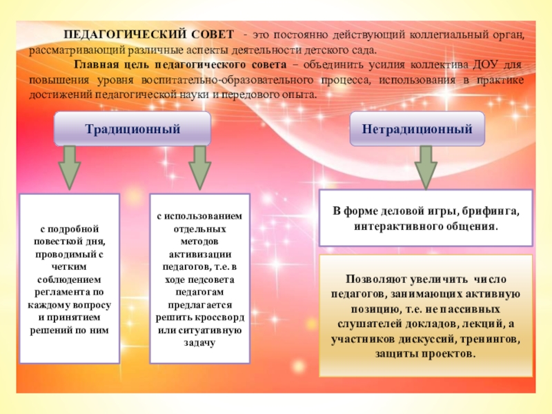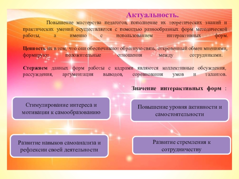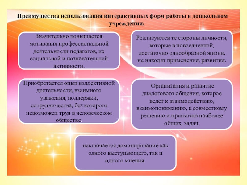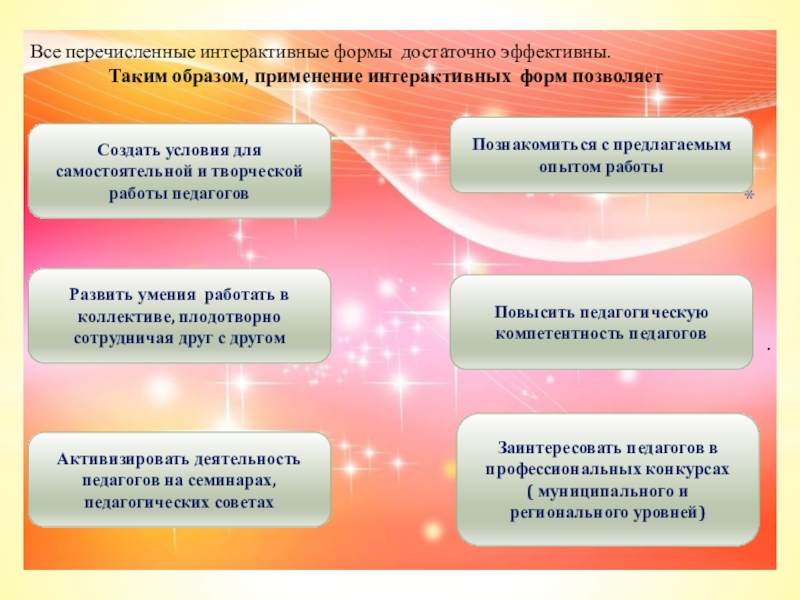 Позволяют увеличить число педагогов, занимающих активную позицию, т.е. не пассивных слушателей докладов, лекций, а участников дискуссий, тренингов, защиты проектов.