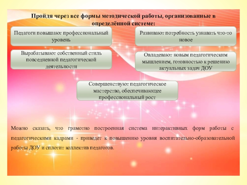Можно сказать, что грамотно построенная система интерактивных форм работы с педагогическими кадрами - приведет к повышению уровня воспитательно-образовательной работы ДОУ и сплотит коллектив педагогов.