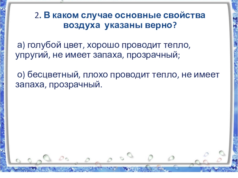 Слайд 42. В каком случае основные свойства воздуха указаны верно?
