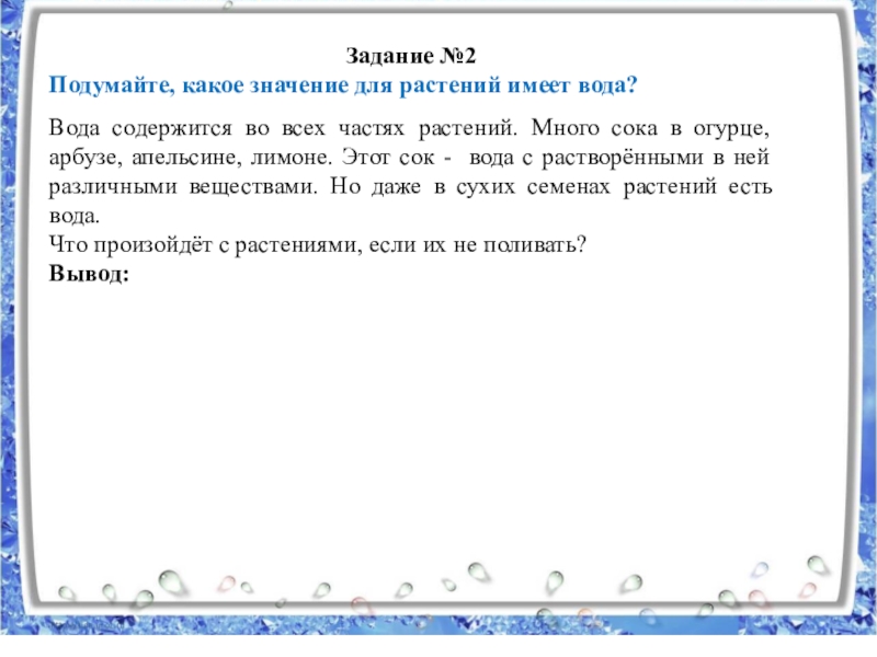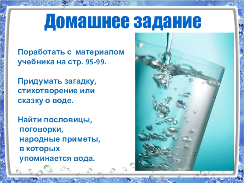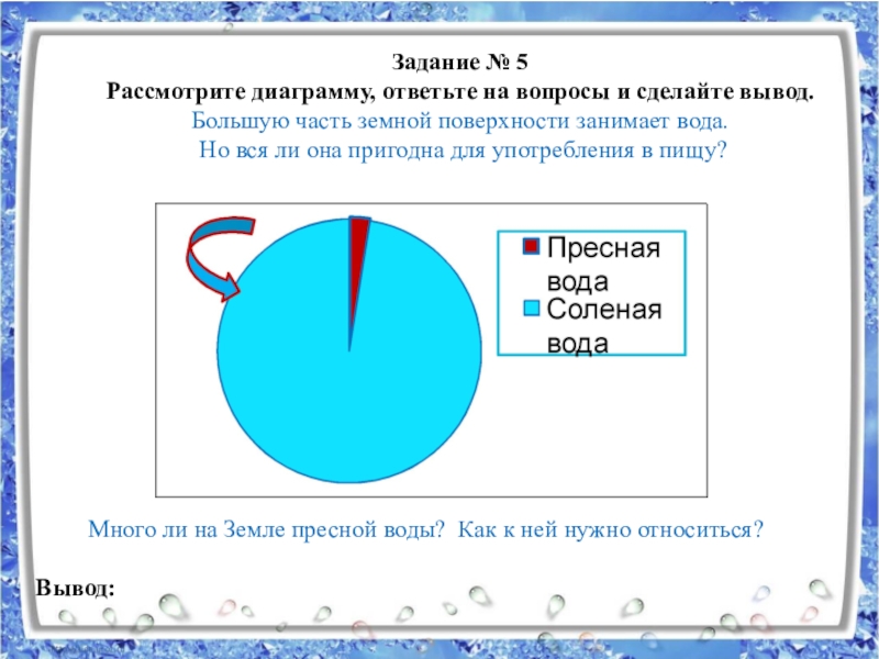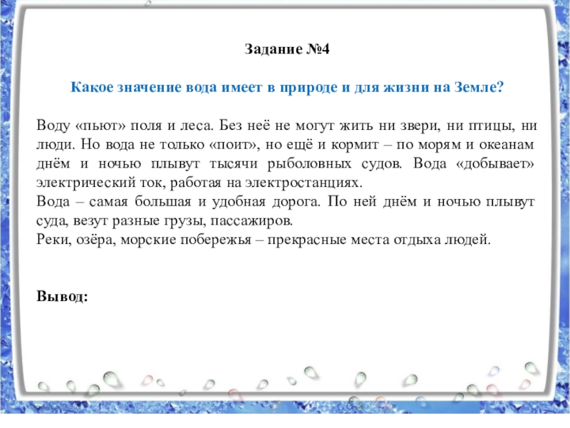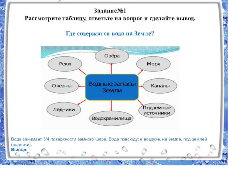 Вода занимает 3/4 поверхности земного шара. Вода повсюду: в воздухе, на земле, под землей (родники).