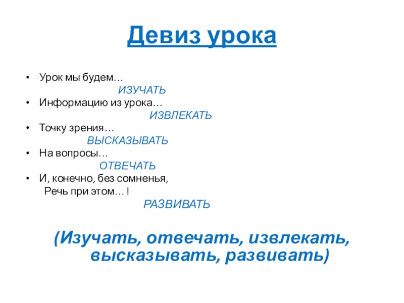 (Изучать, отвечать, извлекать, высказывать, развивать)