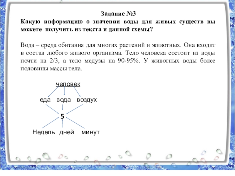 Вода – среда обитания для многих растений и животных. Она входит в состав любого живого организма. Тело человека состоит из воды почти на 2/3, а тело медузы на 90-95%. У животных воды более половины массы тела.