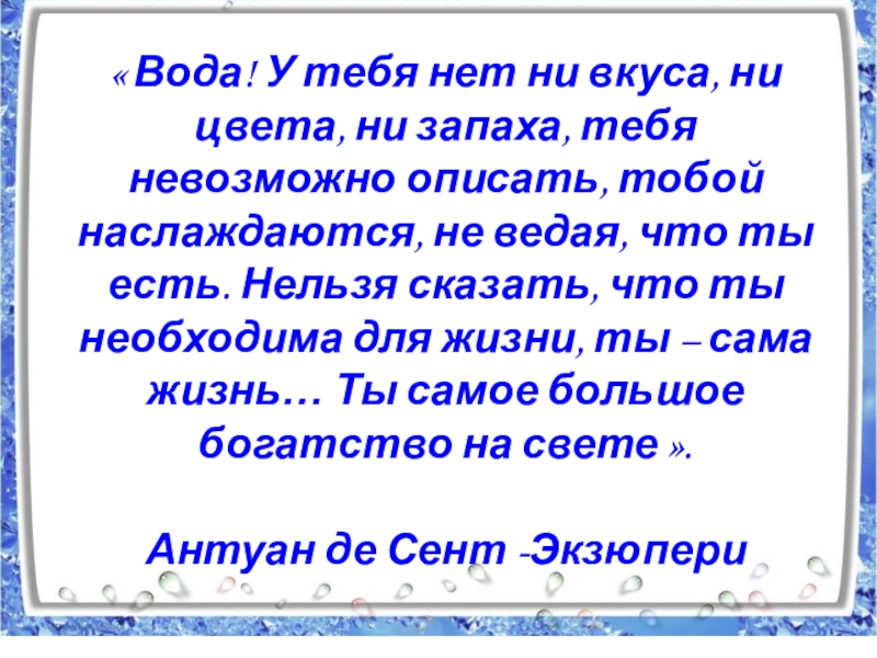 Слайд 18« Вода! У тебя нет ни вкуса, ни цвета, ни запаха,