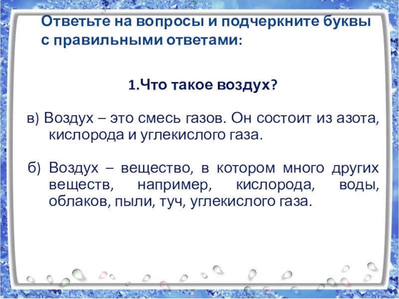 в) Воздух – это смесь газов. Он состоит из азота, кислорода и углекислого газа.