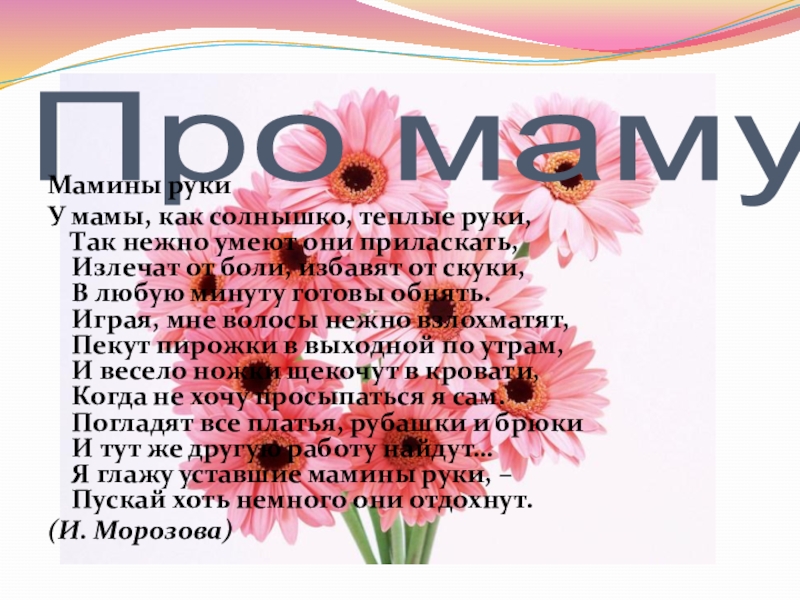 Про мамуМамины руки У мамы, как солнышко, теплые руки, Так нежно умеют они приласкать, Излечат от