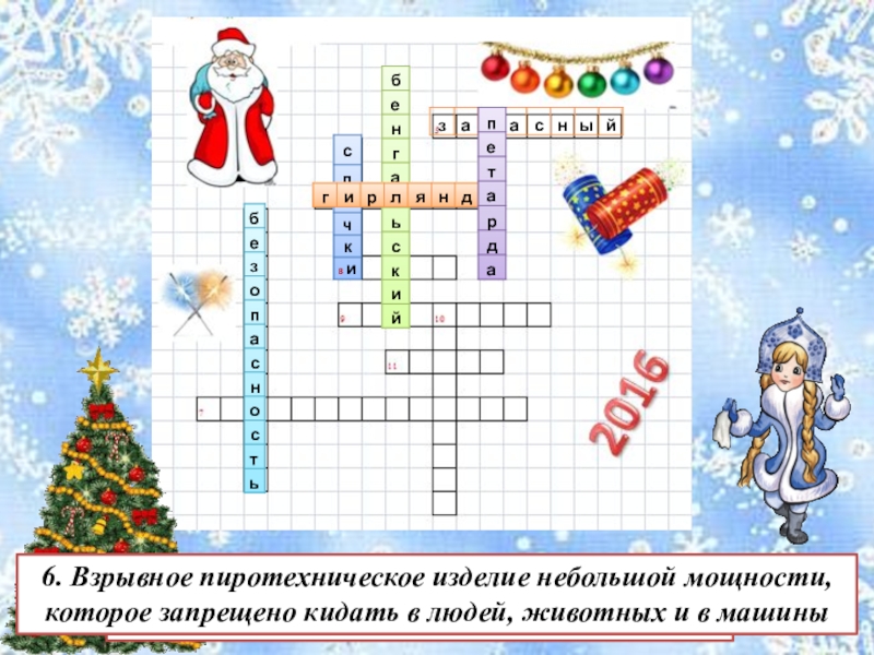 6. Взрывное пиротехническое изделие небольшой мощности, которое запрещено кидать в людей, животных и в машины