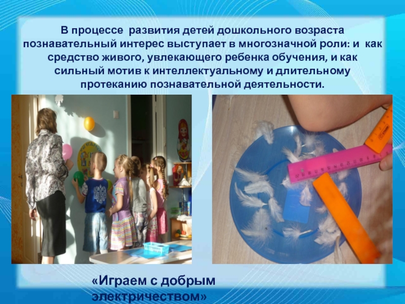 В процессе развития детей дошкольного возраста познавательный интерес выступает в многозначной роли: и как средство живого, увлекающего ребенка обучения, и как сильный мотив к интеллектуальному и длительному протеканию познавательной деятельности.