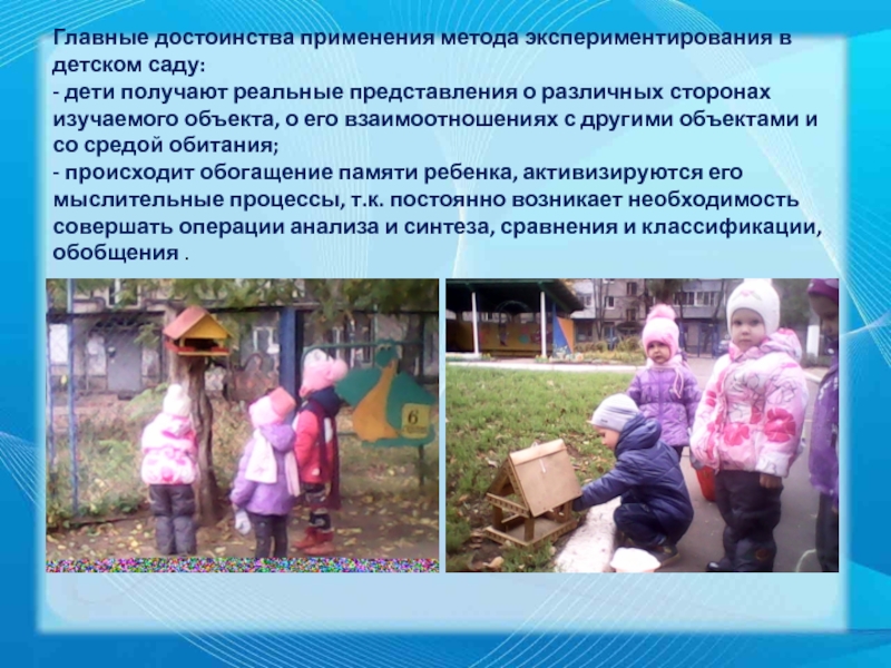 Слайд 7Главные достоинства применения метода экспериментирования в детском саду: