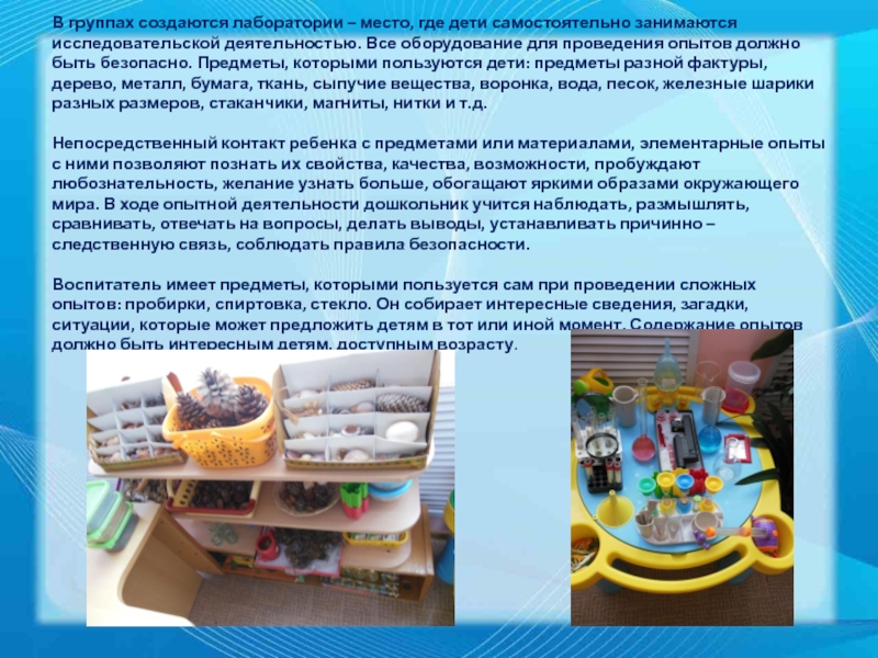 Слайд 11В группах создаются лаборатории – место, где дети самостоятельно занимаются исследовательской
