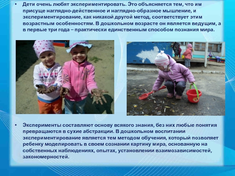 Слайд 12Дети очень любят экспериментировать. Это объясняется тем, что им присуще наглядно-действенное