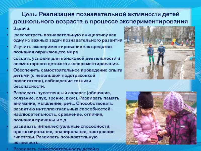 Слайд 2Цель: Реализация познавательной активности детей дошкольного возраста в процессе экспериментирования