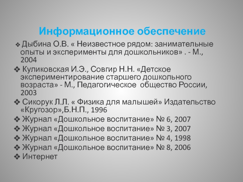 Куликовская И.Э., Совгир Н.Н. «Детское экспериментирование старшего дошкольного возраста» - М., Педагогическое общество России, 2003