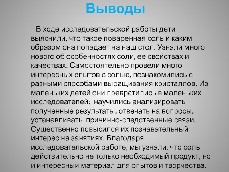 соль и каким образом она попадает на наш стол. Узнали много нового об особенностях соли, ее свойствах и качествах. Самостоятельно провели много интересных опытов с солью, познакомились с разными способами выращивания кристаллов. Из маленьких детей они превратились в маленьких исследователей: научились анализировать полученные результаты, отвечать на вопросы, устанавливать причинно-следственные связи. Существенно повысился их познавательный интерес на занятиях. Благодаря исследовательской работе, мы узнали, что соль действительно не только необходимый продукт, но и интересный материал для опытов и творчества.