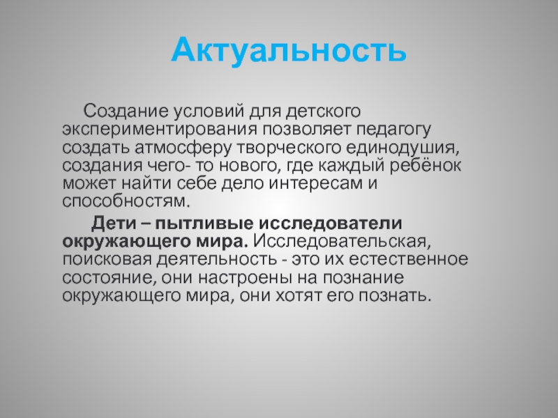 Дети – пытливые исследователи окружающего мира. Исследовательская, поисковая деятельность - это их естественное состояние, они настроены на познание окружающего мира, они хотят его познать.