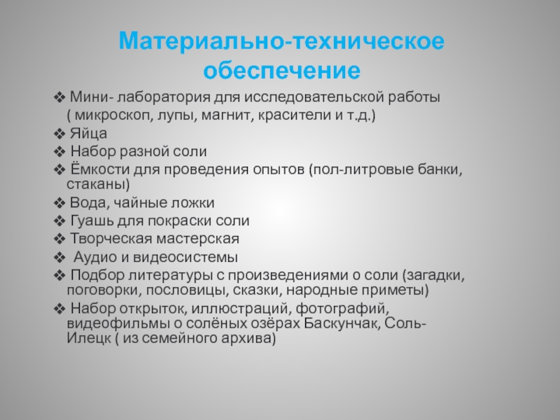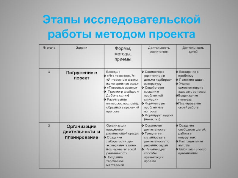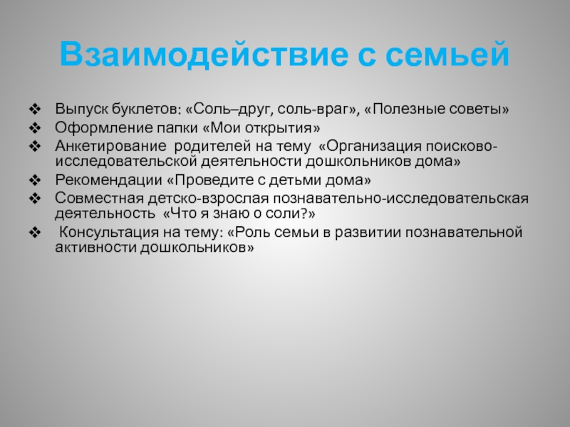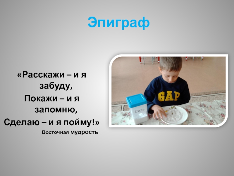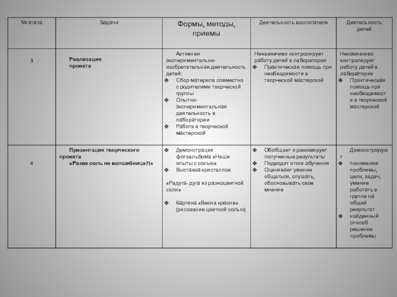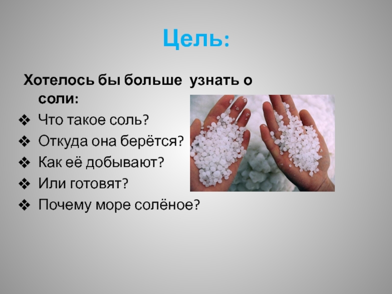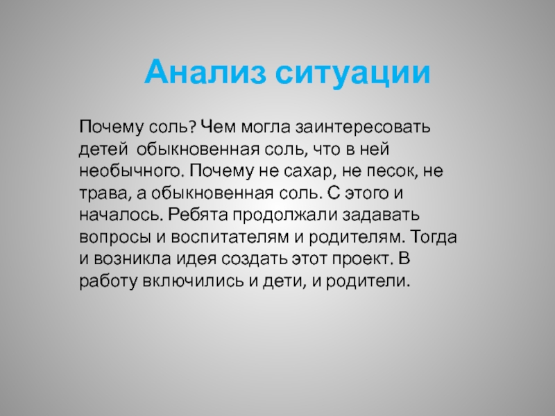 ней необычного. Почему не сахар, не песок, не трава, а обыкновенная соль. С этого и началось. Ребята продолжали задавать вопросы и воспитателям и родителям. Тогда и возникла идея создать этот проект. В работу включились и дети, и родители.