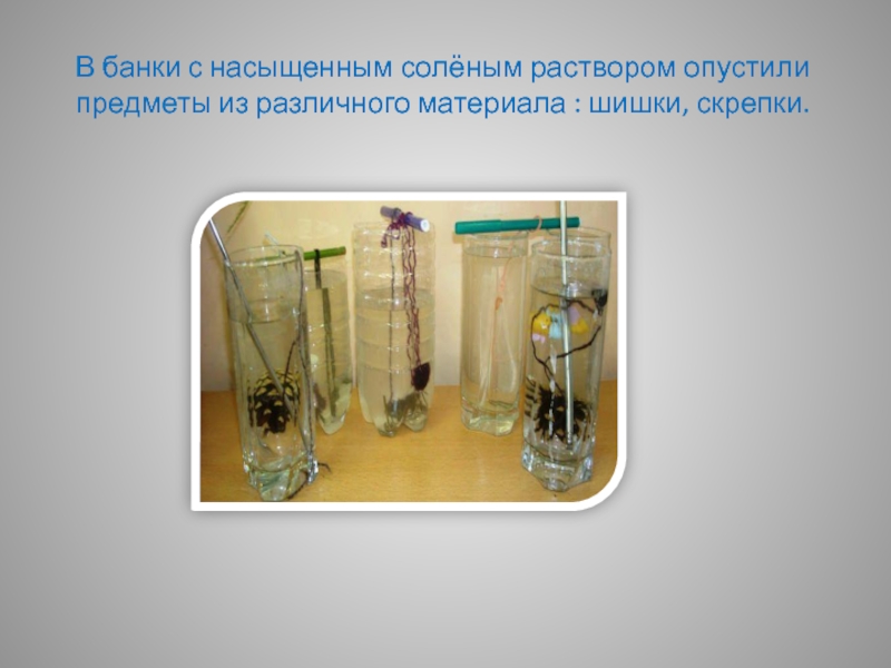 Слайд 21В банки с насыщенным солёным раствором опустили предметы из различного материала