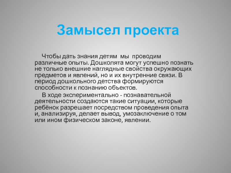 проводим различные опыты. Дошколята могут успешно познать не только внешние наглядные свойства окружающих предметов и явлений, но и их внутренние связи. В период дошкольного детства формируются способности к познанию объектов.