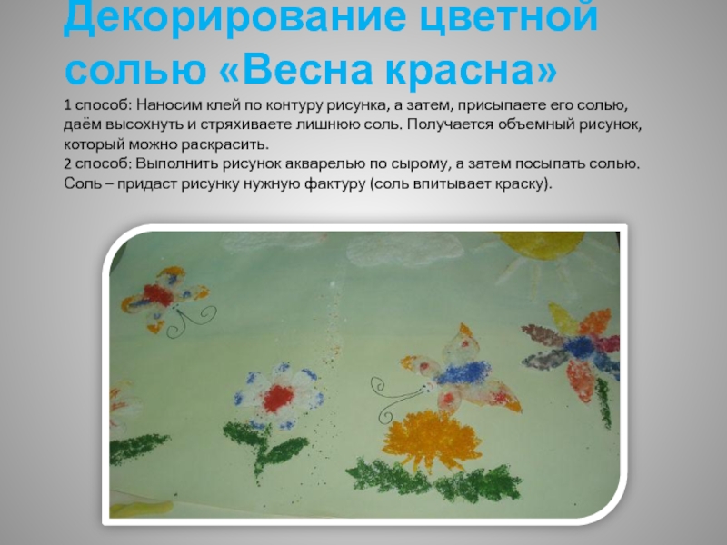 а затем, присыпаете его солью, даём высохнуть и стряхиваете лишнюю соль. Получается объемный рисунок, который можно раскрасить.