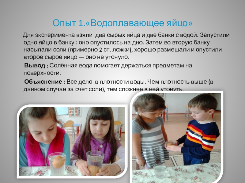 Слайд 18Опыт 1.«Водоплавающее яйцо»