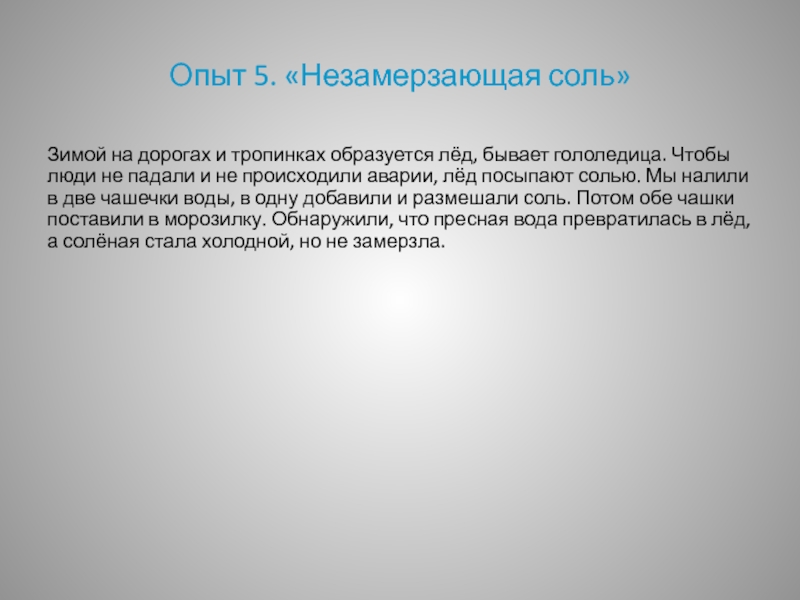 Слайд 26Опыт 5. «Незамерзающая соль»