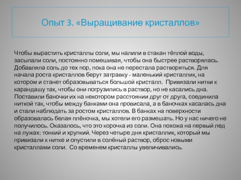 тёплой воды, засыпали соли, постоянно помешивая, чтобы она быстрее растворялась. Добавляла соль до тех пор, пока она не перестала растворяться. Для начала роста кристаллов берут затравку - маленький кристаллик, на котором и станет образовываться большой кристалл. Привязали нитки к карандашу так, чтобы они погрузились в раствор, но не касались дна. Поставили баночки их на некотором расстоянии друг от друга, соединила ниткой так, чтобы между банками она провисала, а в баночках касалась дна и стали наблюдать за ростом кристаллов. В банках на поверхности образовалась белая плёночка, мы хотели его размешать. Но у нас ничего не получилось. Оказалось, что это корочка из соли. Она похожа на первый лед на лужах: тонкий и хрупкий. Через четыре дня кристаллик, который мы привязали к нитке и опустили в солёный раствор, оброс новыми кристаллами соли. Со временем кристаллы увеличивались.