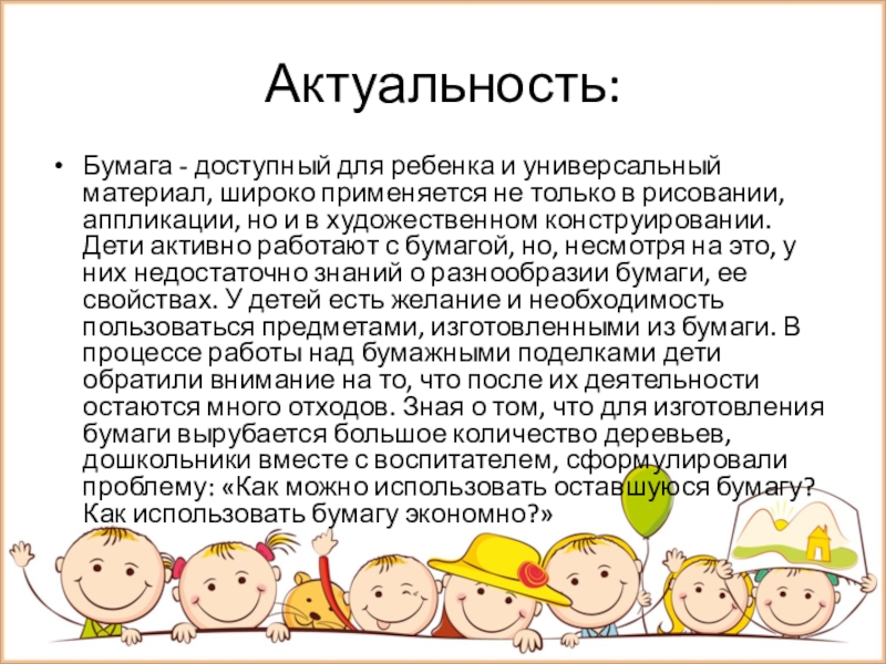 только в рисовании, аппликации, но и в художественном конструировании. Дети активно работают с бумагой, но, несмотря на это, у них недостаточно знаний о разнообразии бумаги, ее свойствах. У детей есть желание и необходимость пользоваться предметами, изготовленными из бумаги. В процессе работы над бумажными поделками дети обратили внимание на то, что после их деятельности остаются много отходов. Зная о том, что для изготовления бумаги вырубается большое количество деревьев, дошкольники вместе с воспитателем, сформулировали проблему: «Как можно использовать оставшуюся бумагу? Как использовать бумагу экономно?»