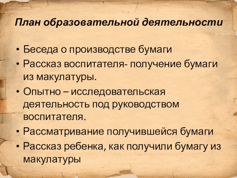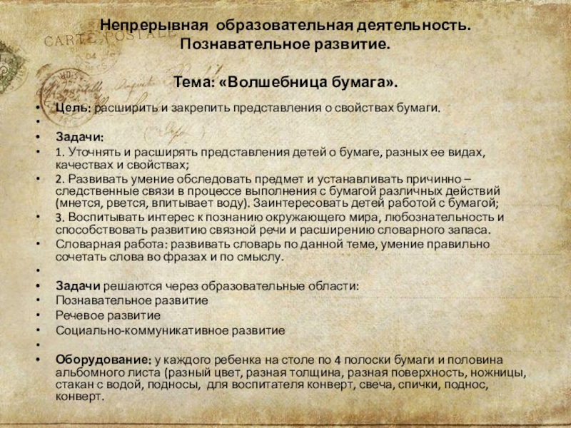 Дать представление о значении бумаги в жизни человека, о ее истории происхождения, разнообразии и свойствах.