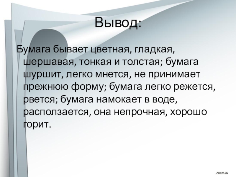 легко мнется, не принимает прежнюю форму; бумага легко режется, рвется; бумага намокает в воде, расползается, она непрочная, хорошо горит.