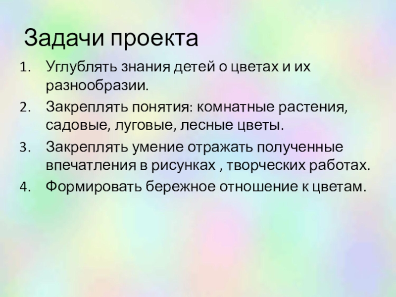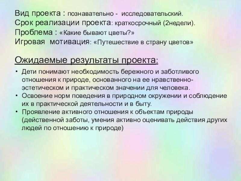 Срок реализации проекта: краткосрочный (2недели). Проблема : «Какие бывают цветы?»
