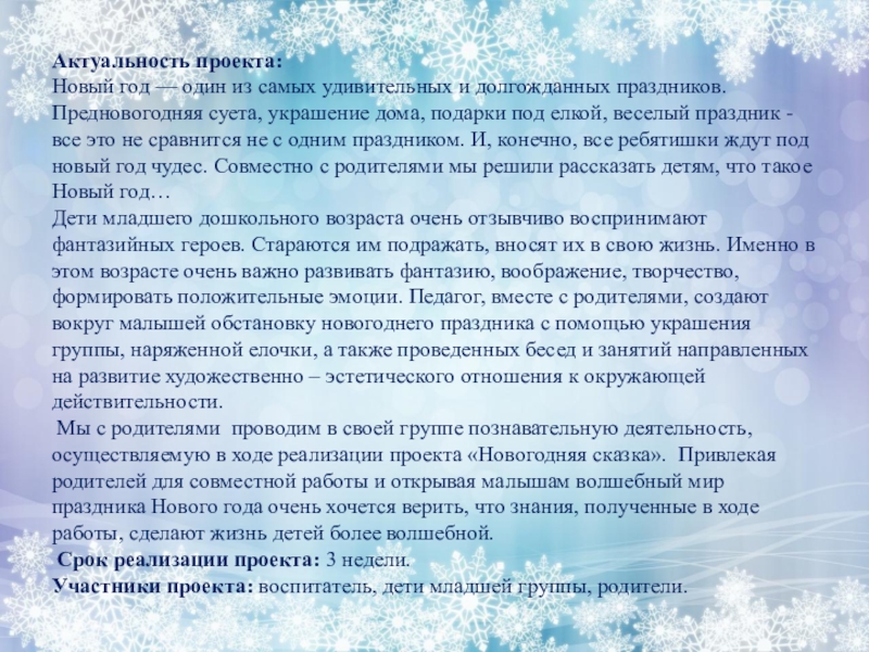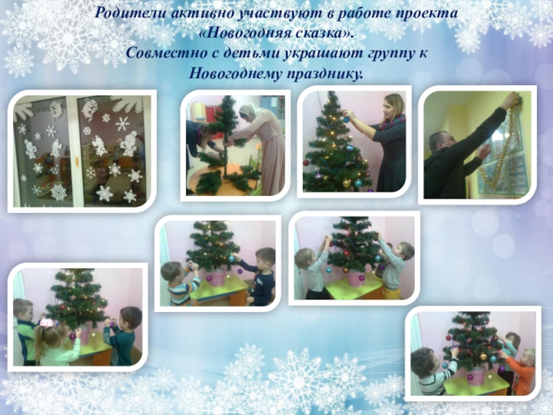 Мы с родителями проводим в своей группе познавательную деятельность, осуществляемую в ходе реализации проекта «Новогодняя сказка». Привлекая родителей для совместной работы и открывая малышам волшебный мир праздника Нового года очень хочется верить, что знания, полученные в ходе работы, сделают жизнь детей более волшебной.