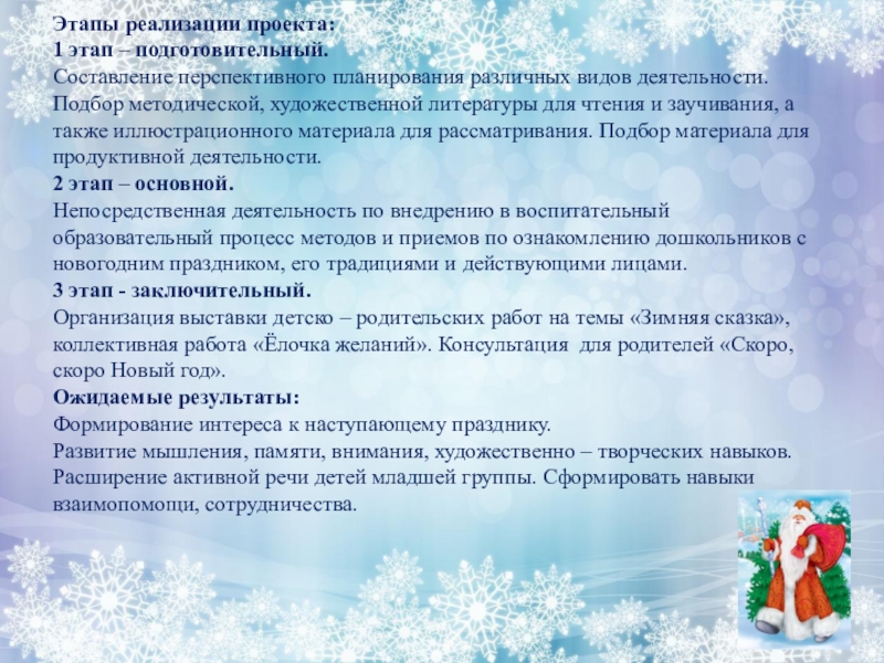 Непосредственная деятельность по внедрению в воспитательный образовательный процесс методов и приемов по ознакомлению дошкольников с новогодним праздником, его традициями и действующими лицами.
