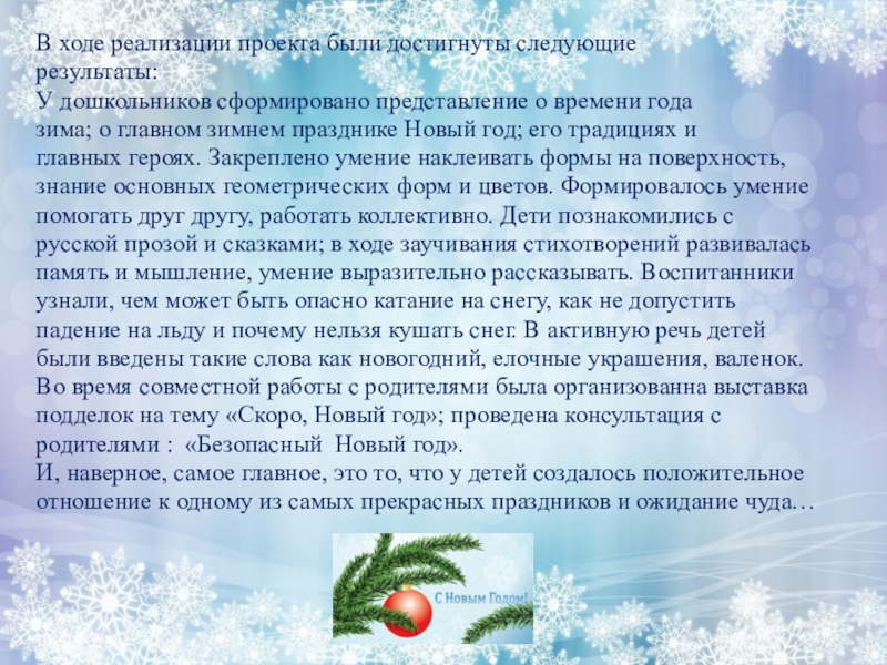 Предновогодняя суета, украшение дома, подарки под елкой, веселый праздник - все это не сравнится не с одним праздником. И, конечно, все ребятишки ждут под новый год чудес. Совместно с родителями мы решили рассказать детям, что такое Новый год…