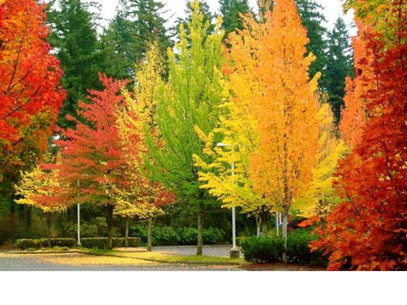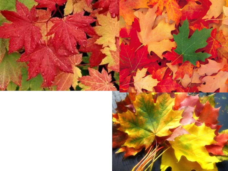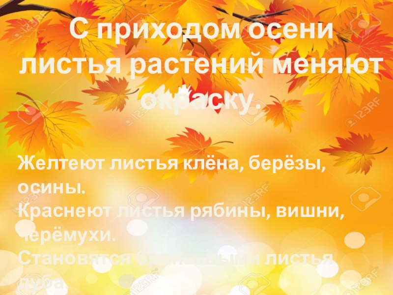 С приходом осени листья растений меняют окраску.Желтеют листья клёна, берёзы, осины.Краснеют листья рябины, вишни, черёмухи.Становятся бронзовыми листья