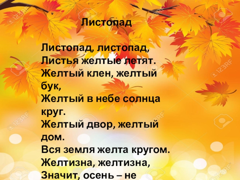 Листопад  Листопад, листопад, Листья желтые летят. Желтый клен, желтый бук, Желтый в небе солнца круг. Желтый двор, желтый